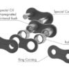 Breakage of the chains connecting link is no issue at Tsubaki thanks to this unique feature. By applying the patented Ring Coining process, Tsubaki generates a cold deformation around the pin hole of the connecting link plate. This results in residual stress around the pin hole and thereby adds strength. By using this process transmission capacity is 100% of the base chain.